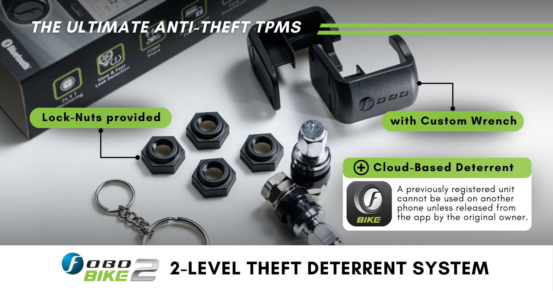 a) Sensors are tied to a FOBO account after installation. They are not re-usable or transferable without the owner releasing them from his/her FOBO account. This theft deterrent feature removes the economic value of a stolen sensor to discourage theft. b) FOBO Bike 2 package comes with anti-theft lock-nuts and a special wrench. The anti-theft locking system will lock your sensor against others from unscrewing it.