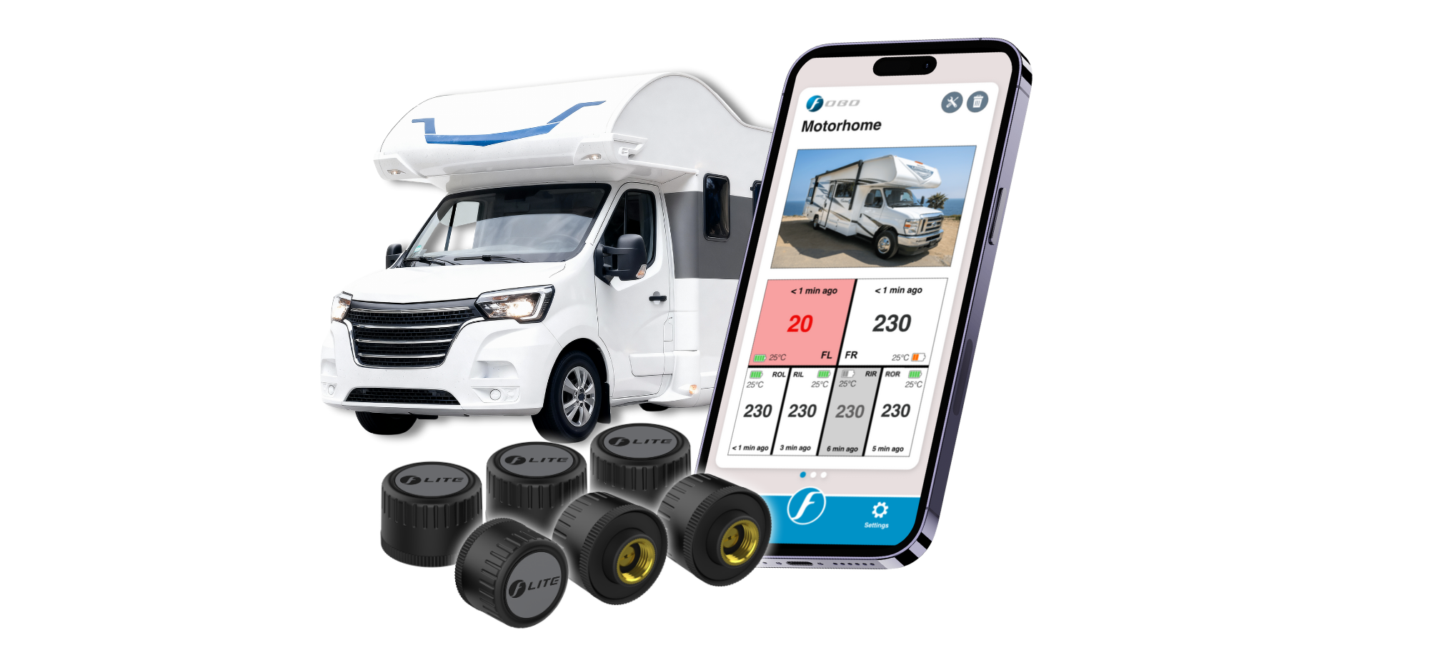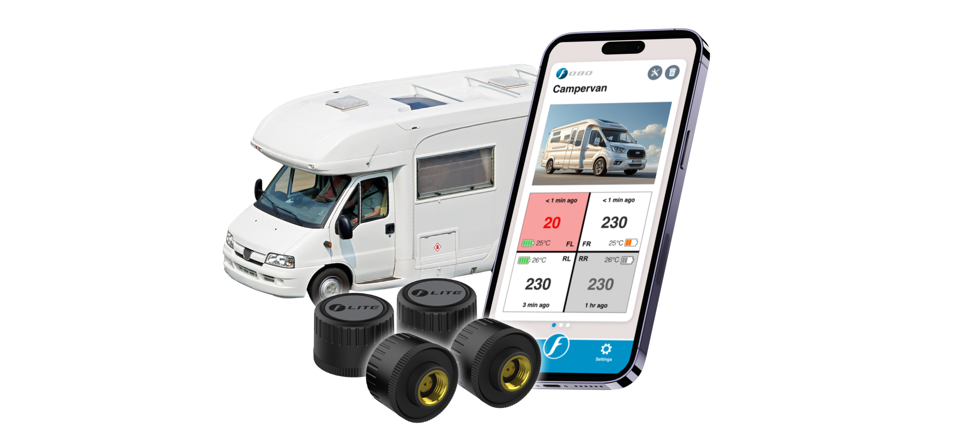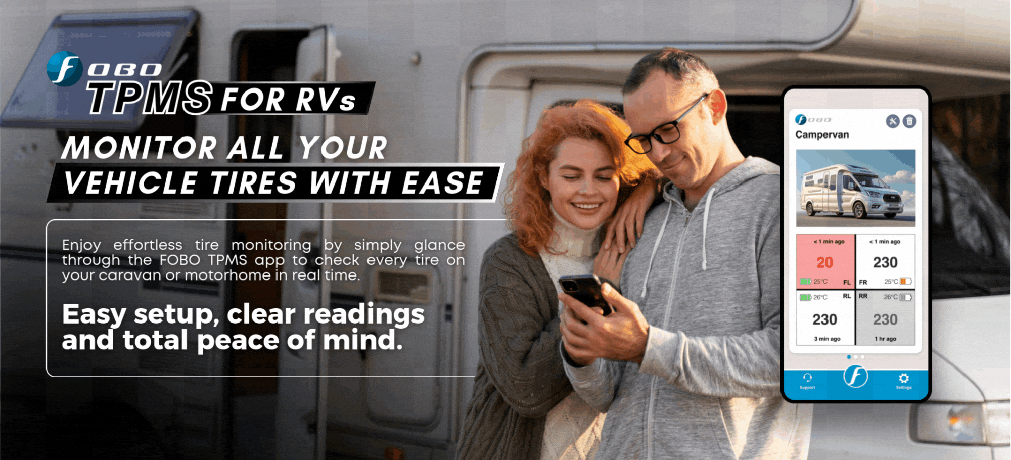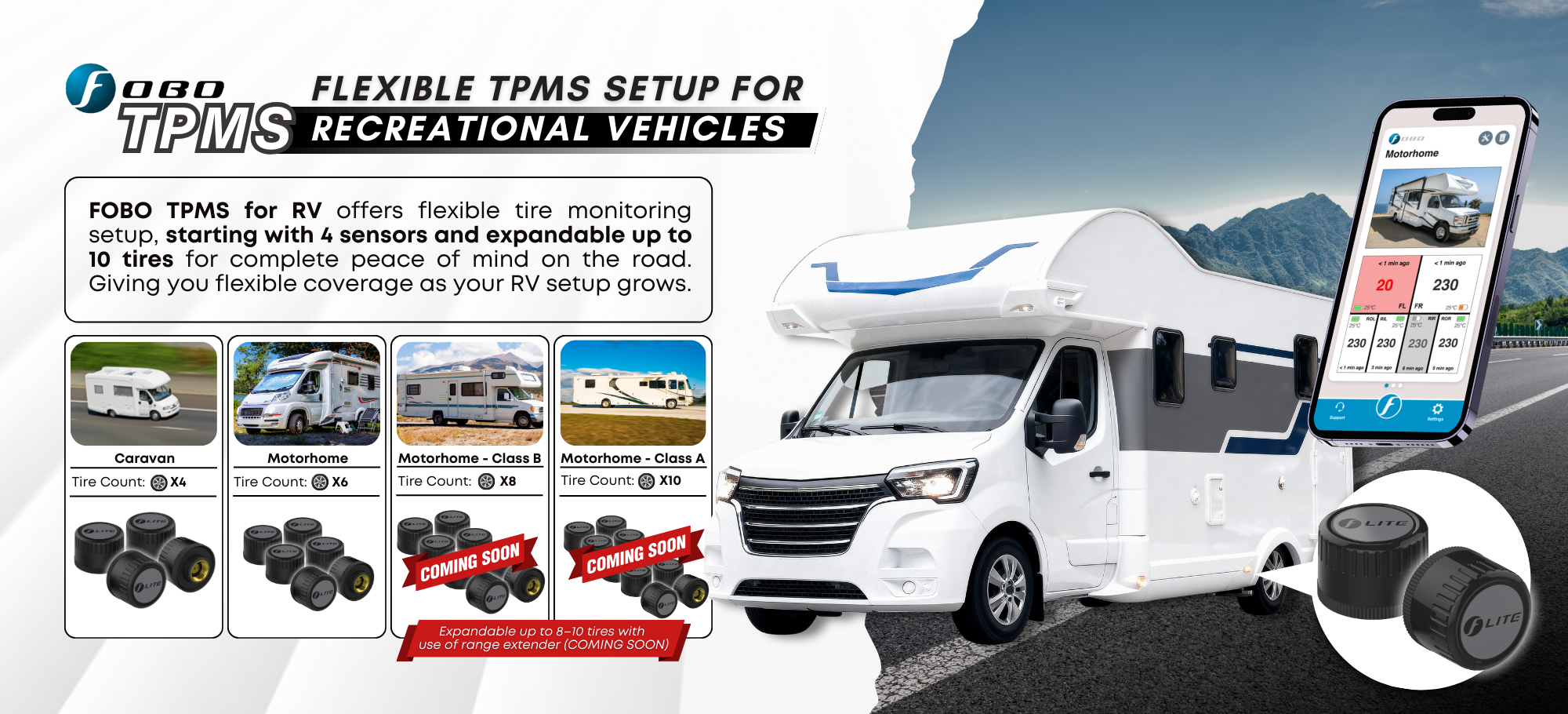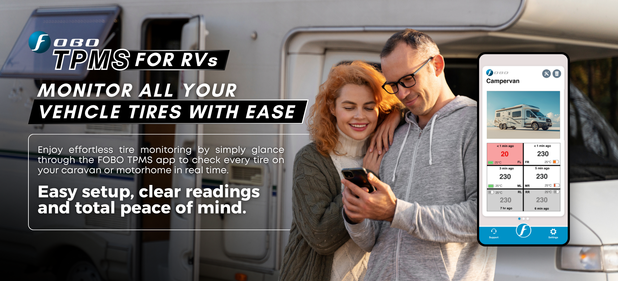 FOBO TPMS for RVs is made for Recreational Vehicles (RVs), caravans and motorhomes, giving you added confidence on every journey. Starting with a 4-tire setup and can be expanded to monitor up to 10 tires, it keeps an eye on your tires as you travel, helping you catch tire issues early and enjoy a smoother, safer journey.